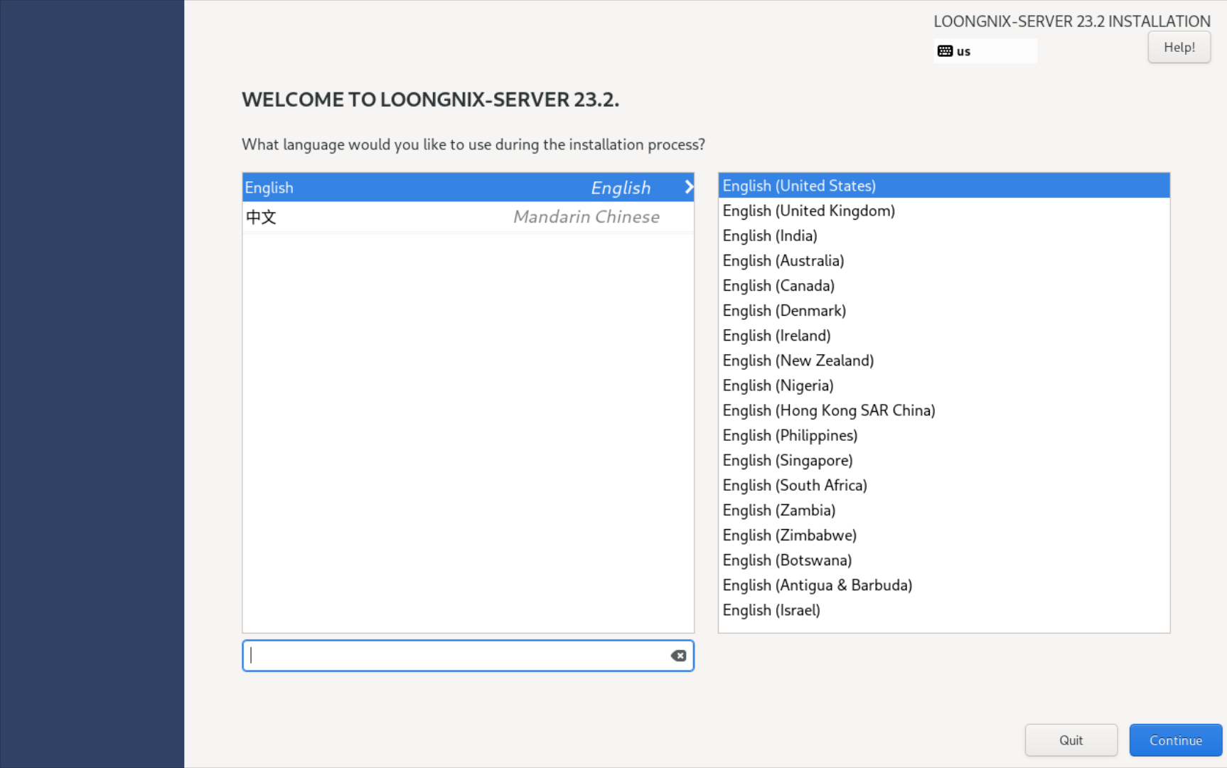通过上一步选择内核引导,等待进入操作系统,此时,点击 Install Loongnix-Server 23.2安装程序,开启安装之旅,如图所示: